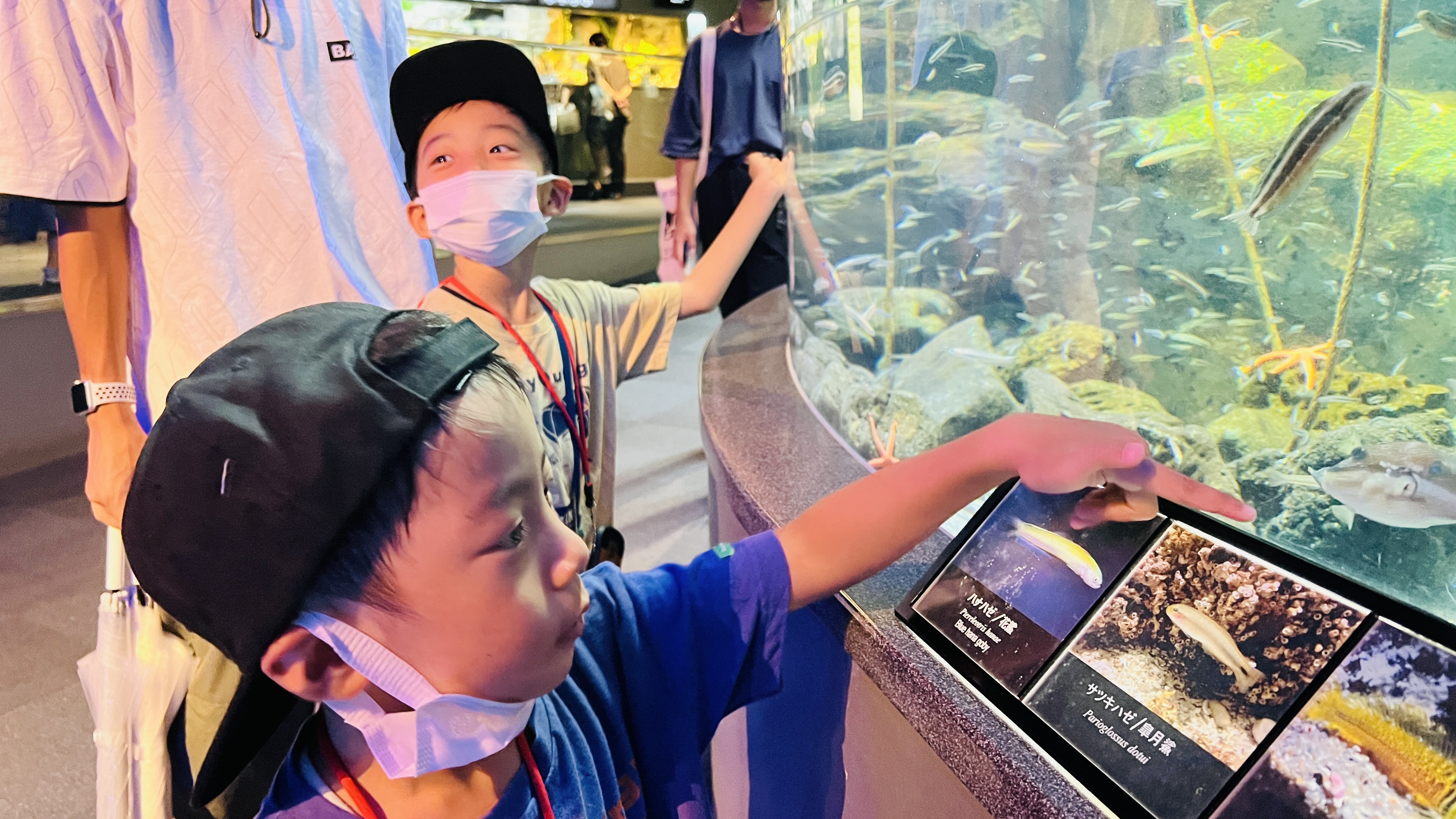 커다란 어항 안의 물고기를 관찰하는 두 꾸러기들