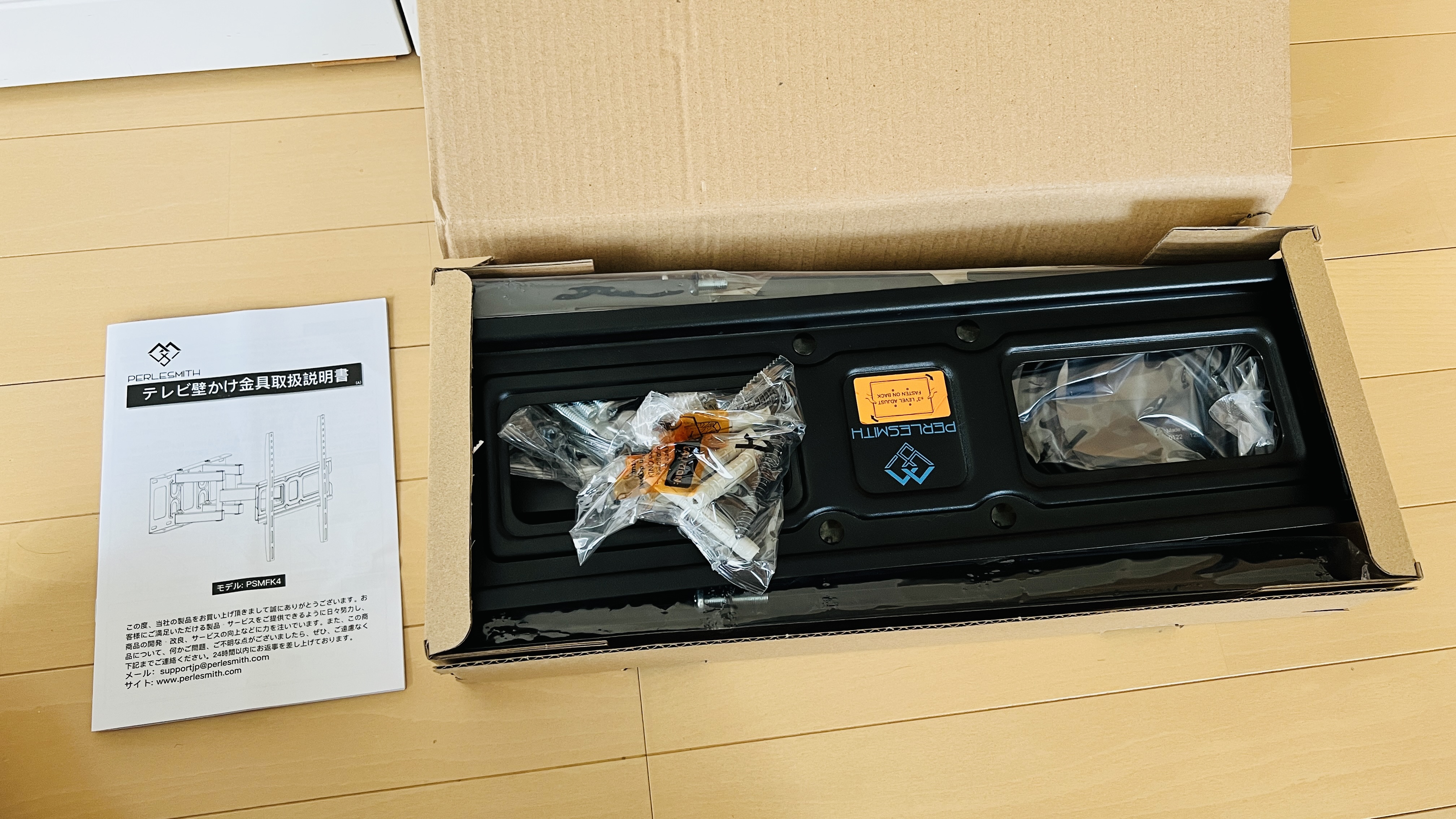 박스를 열면 벽걸이 본체와, TV뒤쪽 브라켓 2개, 각종 볼트 너트들, 설명서, 보너스 HDMI케이블이 있습니다.