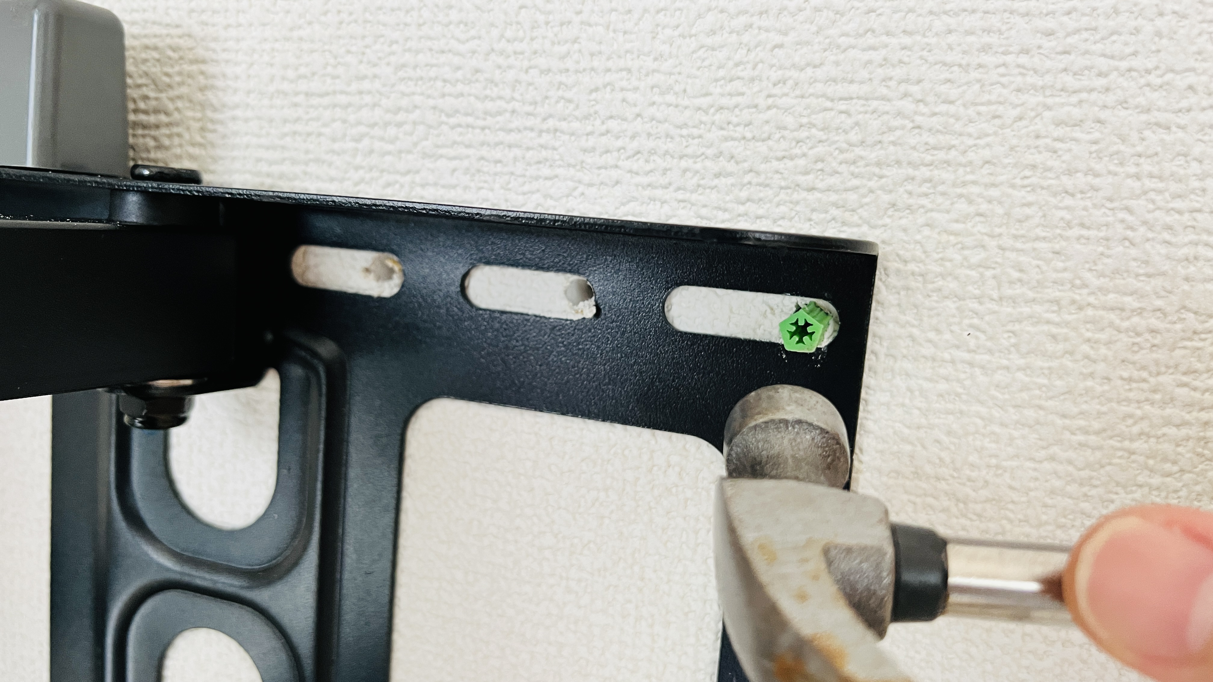 다시 한번 벽걸이에 TV를 연결한 채로 번쩍들어서 해당 라인과 나무기둥 사이에 벽걸이 구멍을 위치하고